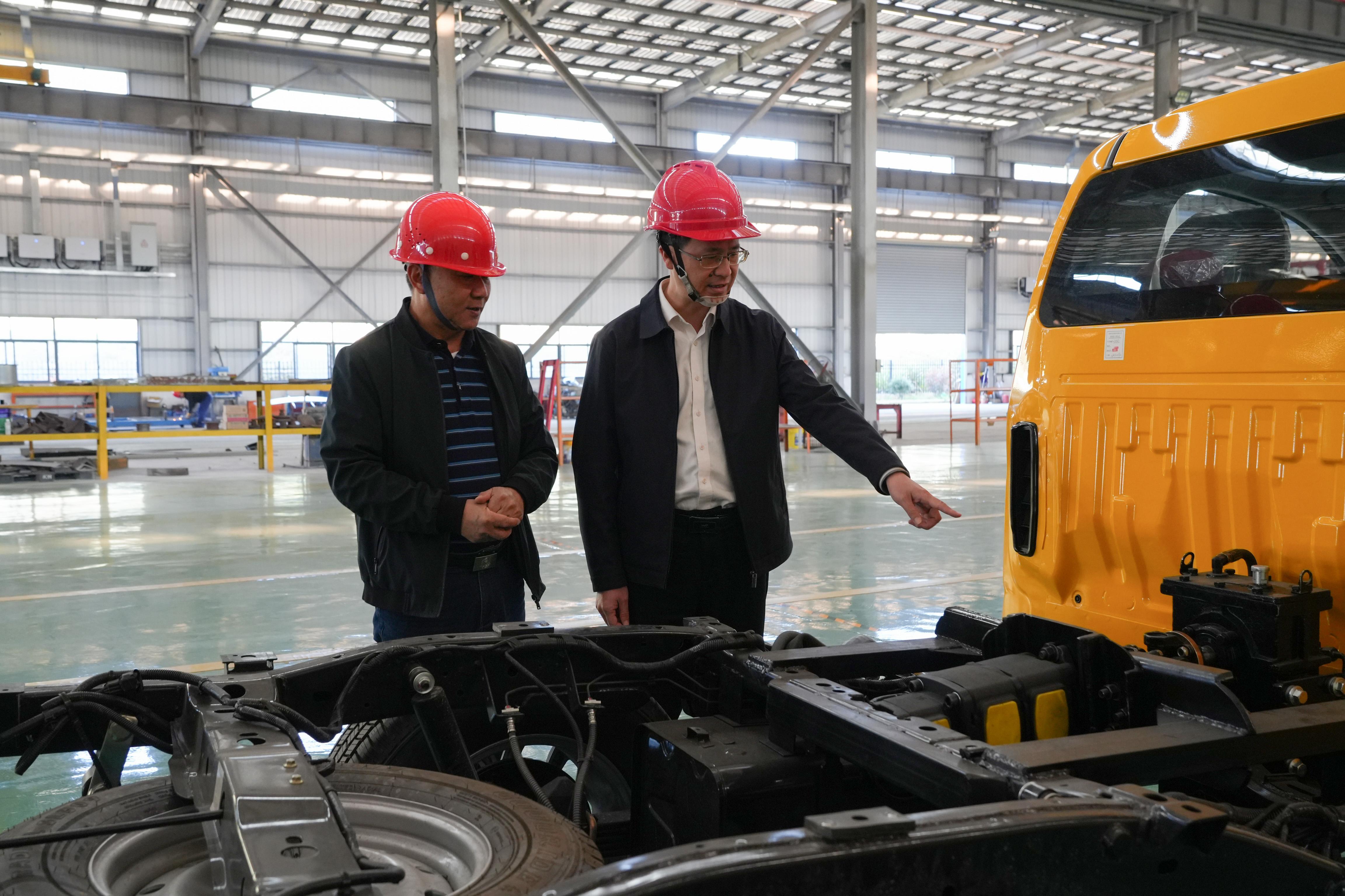 龙岩市武平县岩前镇干部(右)在闽鸿顺专用车生产车间了解企业订单情况。武平县融媒体中心供图